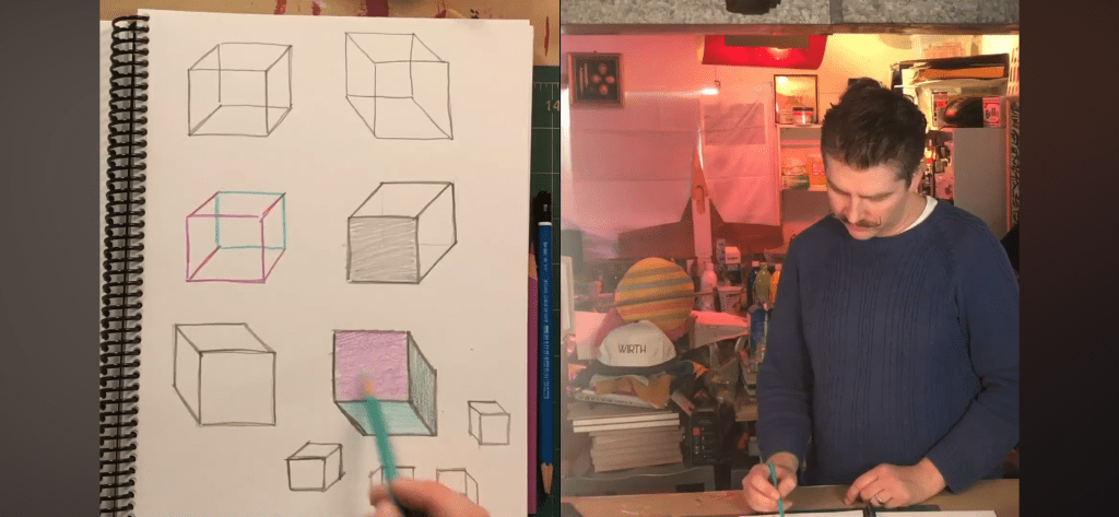 Notes: Yes, he does give a brief view into perspective, you can see it as he adjusts the “viewing” angle of some of the boxes.